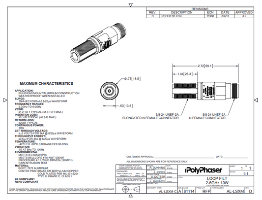 POLYPHASER AL-LSXM RF Coaxial High Pass Filter Protector 2.0 to 6.0Ghz N-Female