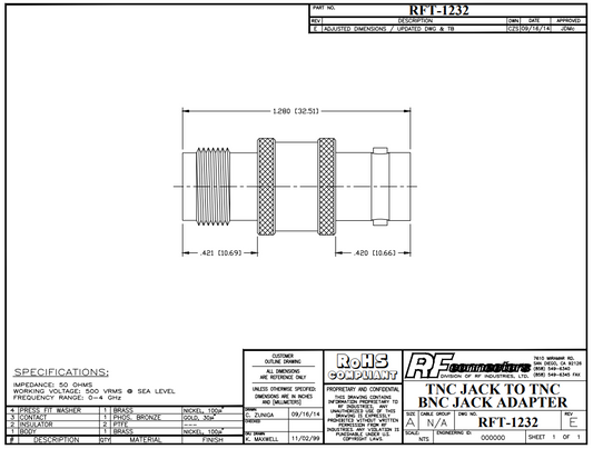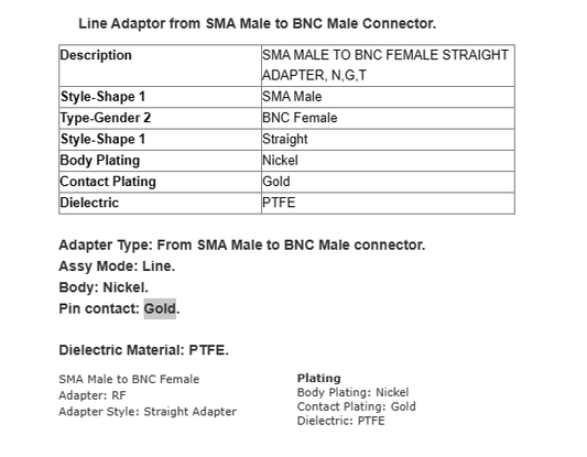 RFT-1231 Straight Adaptor from TNC Male Connector to BNC Female Nickel PTFE
