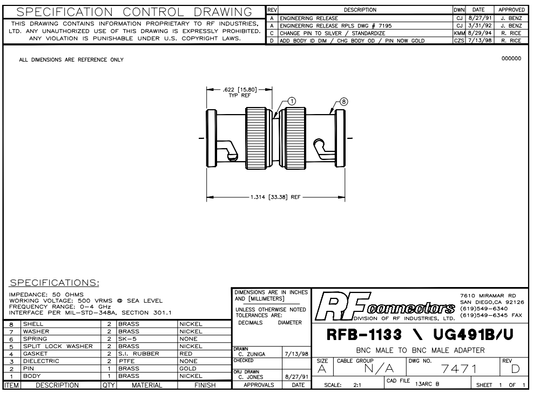 RFB-1133 50 Ohm Straight Barrel Type Adaptor, BNC Male to BNC Male Connectors