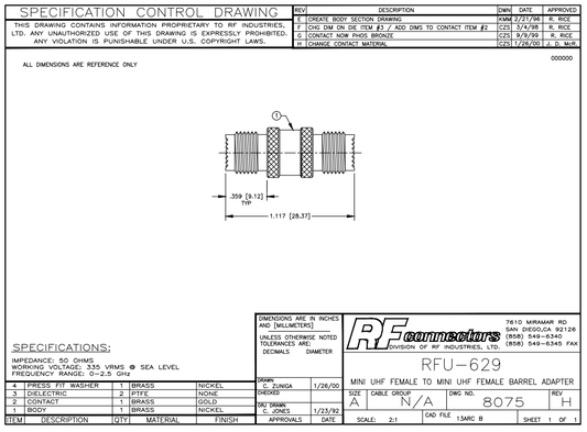 RFU-629 Straight Barrel Adapter Mini-UHF Female Connector to Mini-UHF Female