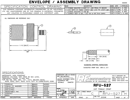 RFU-527 UHF Female Connector (SO-239) to Crimp on RG-58/U, RG-142/U Cables