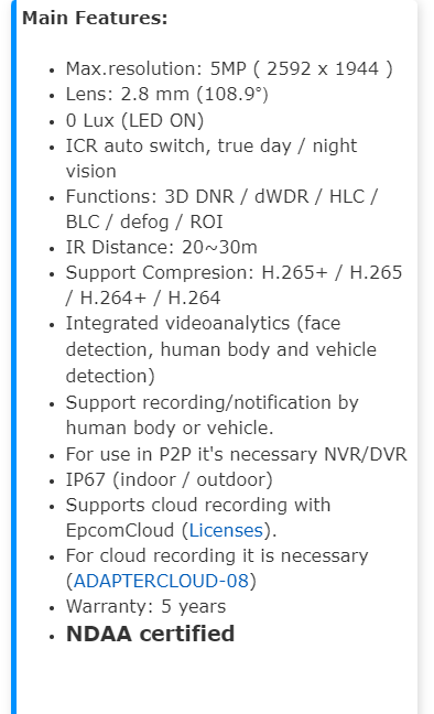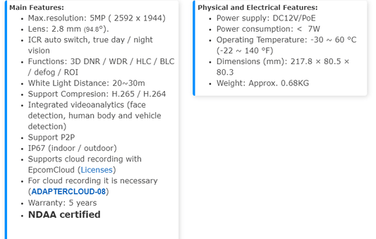 IP Camera Bullet 5 MP POE WDR Micro SD IP67 2.8 mm Lens Metal XB54CA-GEN3