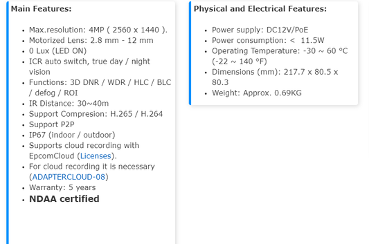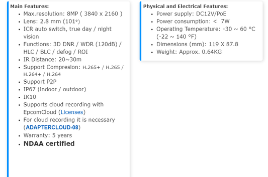 Dome IP Camera 8 MP POE Night Vision WDR (120dB) Micro SD IP67 Metal XD82M-GEN3