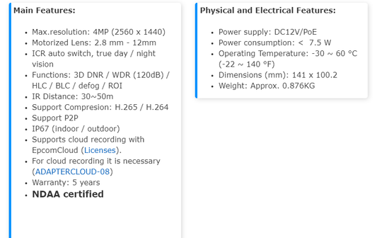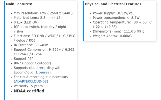 IP Camera Turret 4 Megapixel POE 131ft (40m) WDR IP67 Integrated Mic XE42ZC-GEN3